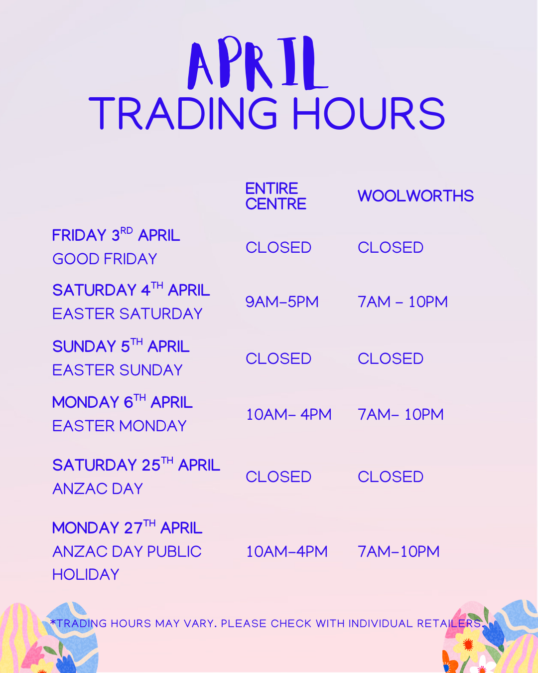 Happy Easter! We wish you all a safe and wonderful long weekend. Trading Hours may vary, please check with individual retailers.