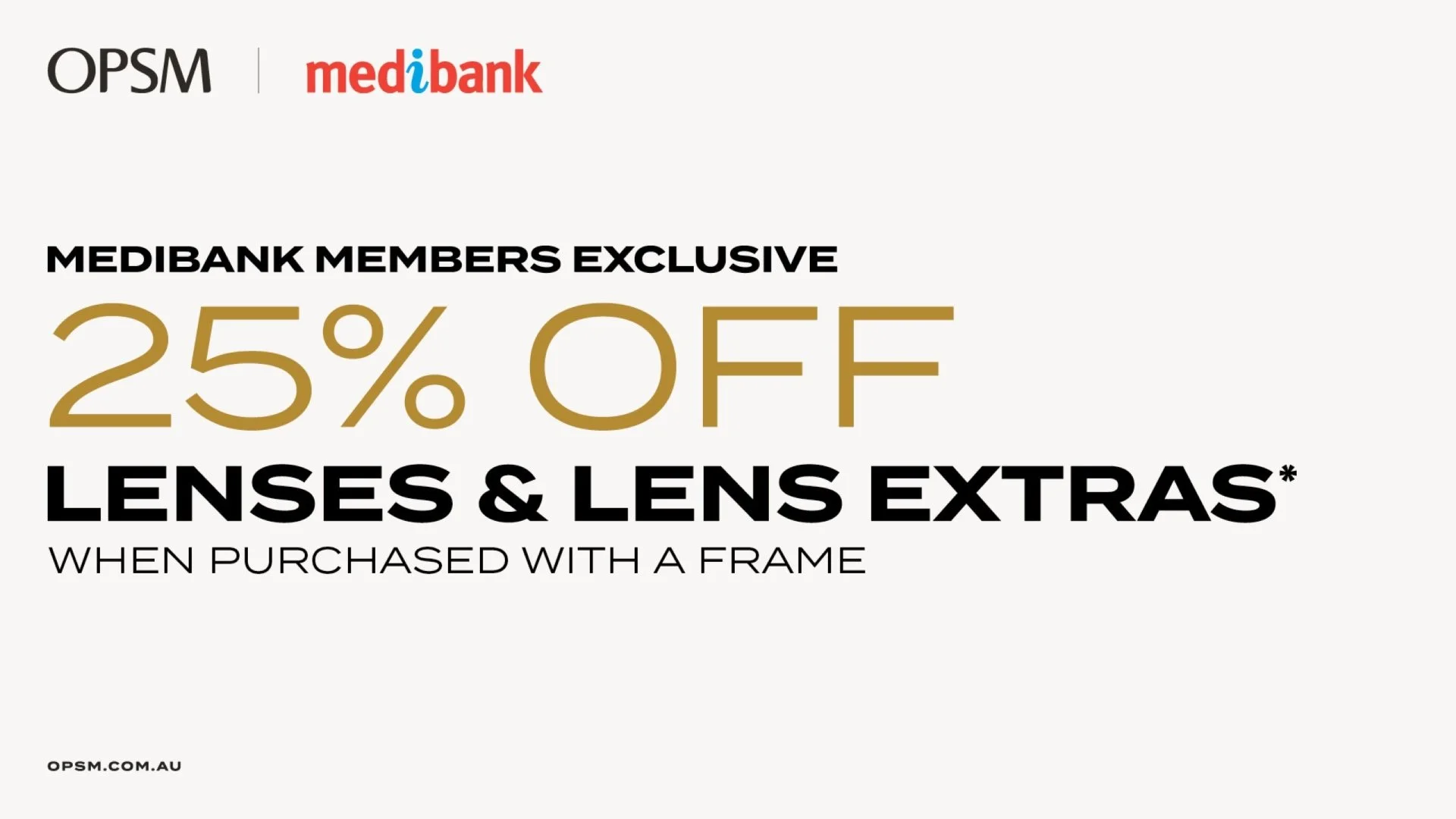 For a limited time at OPSM, eligible Medibank Members get 25% off lenses and lens extras, when purchased with a frame. Choose from your favourite brands like Ray-Ban, Oakley and Vogue. Hurry, offer ends 14 November. OPSM accept all health funds and bulk billed eye tests are also available for eligible Medicare cardholders.